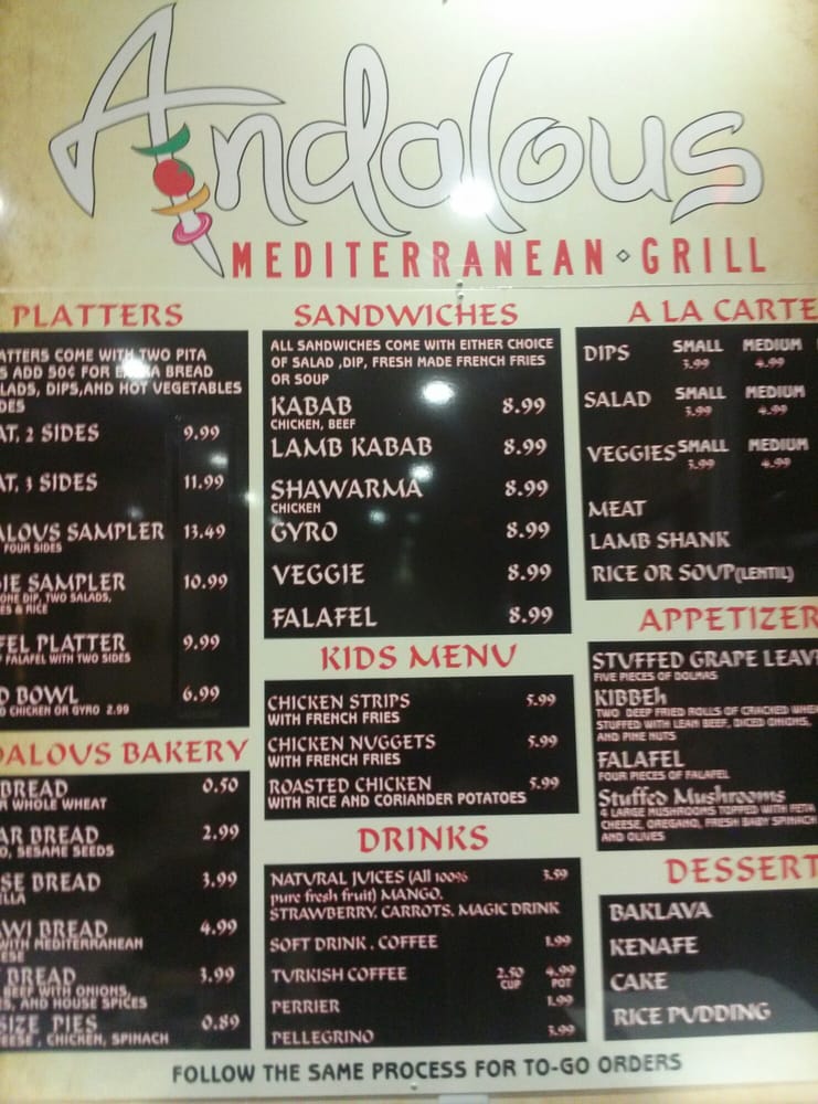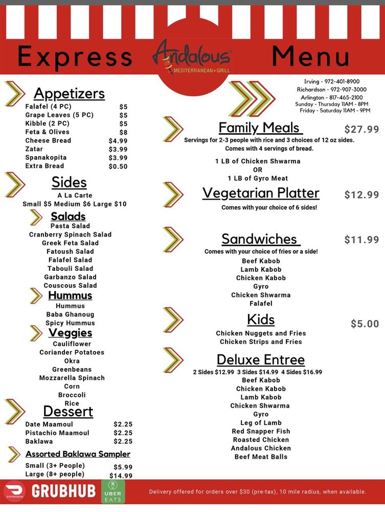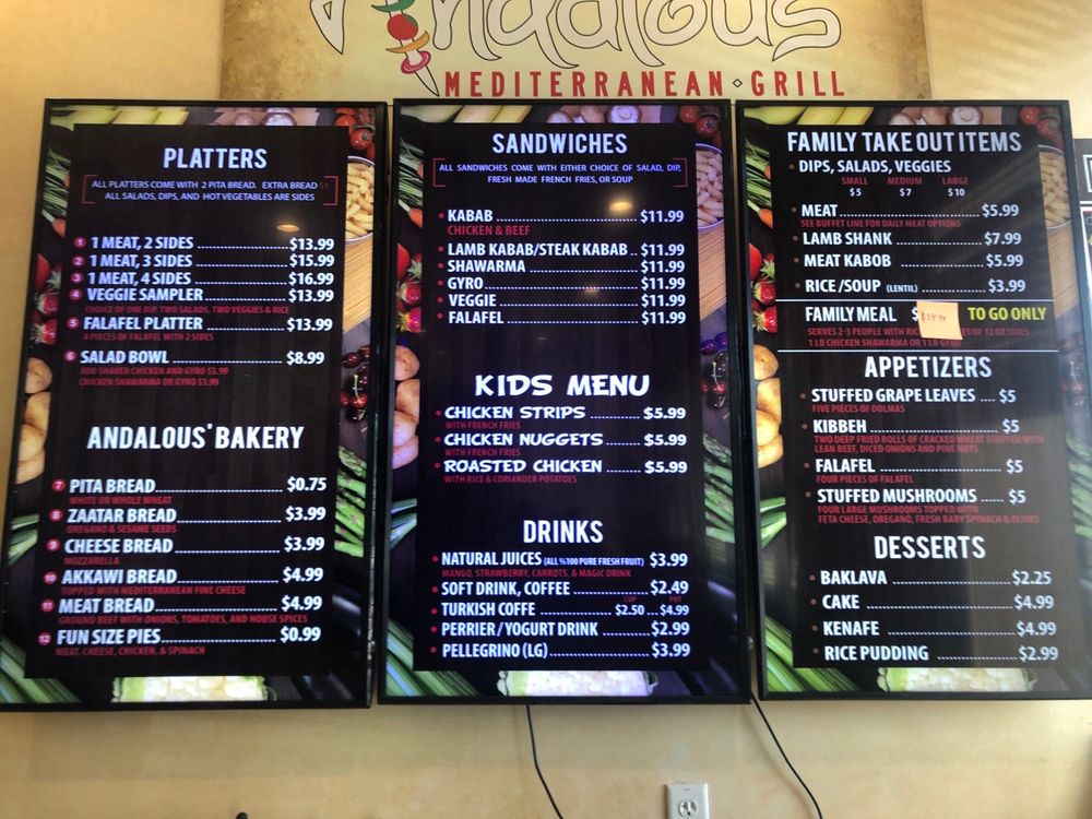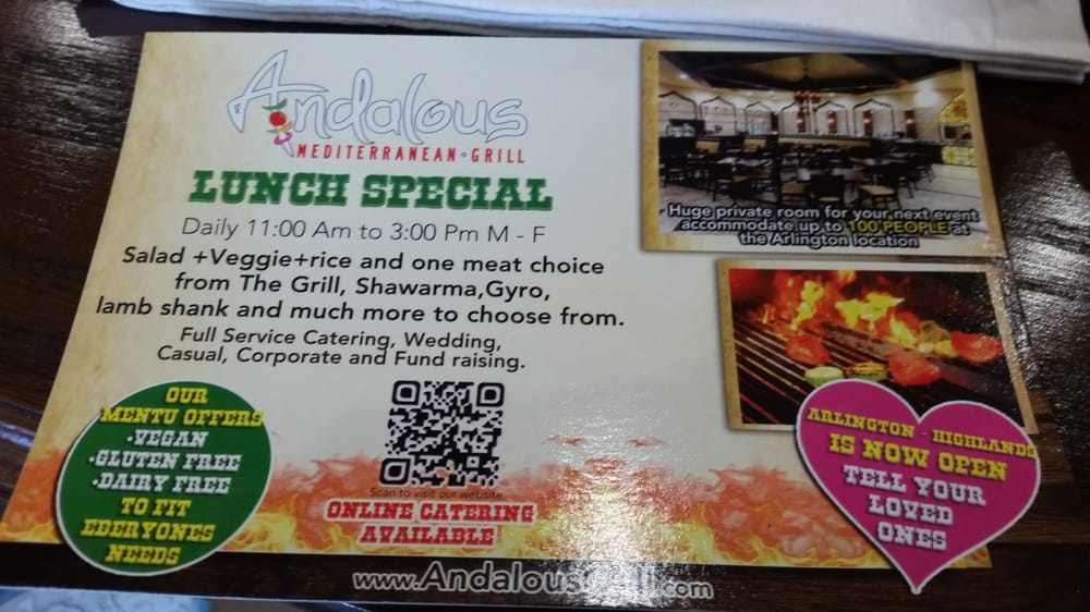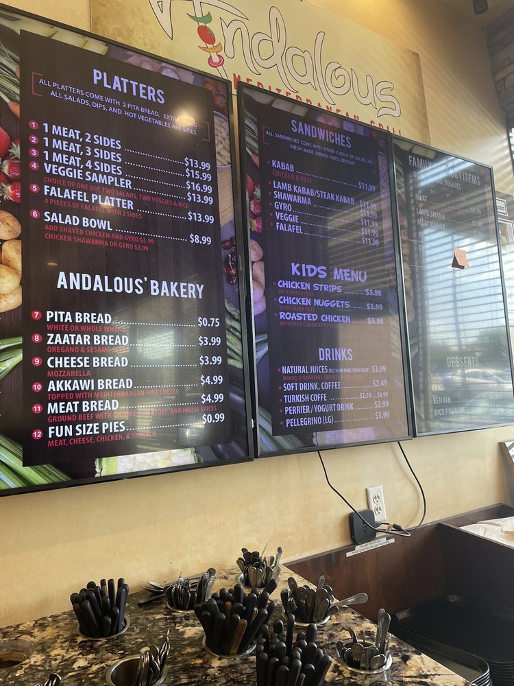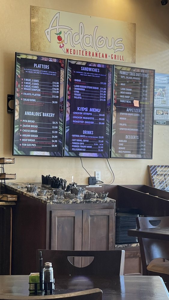 Andalous Mediterranean Grill-Arlington offers a wide array of Mediterranean delights, from flavorful appetizers like Dolmas and Falafel to refreshing salads such as Fattoush and Spinach & Cabbage Salad. The menu boasts mouth-watering sandwiches like Chicken Kabab and Steak Kabab, each served with a side of your choice. Customers rave about the fresh and delicious food, friendly service, and accommodating staff. With options for pescatarians, vegans, and vegetarians, Andalous Mediterranean Grill-Arlington caters to a diverse range of dietary preferences. The casual and inviting atmosphere, along with the quick and attentive service, make it a perfect spot for a lunch meeting or dinner with family and friends. Don't miss out on the opportunity to experience the vibrant flavors of Mediterranean cuisine at Andalous Mediterranean Grill-Arlington.
